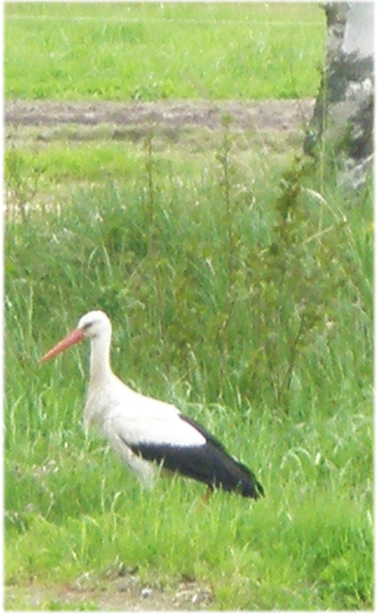 Kattohaikara (ciconia ciconia) kävi 28.5 piipahtamassa aivan talouskeskuksen tuntumassa. Noin tunnin ajan ihasteltiin "oranssinokan" verkkaista askellusta lähipellolla. (Kuva:Havsgårdar)
