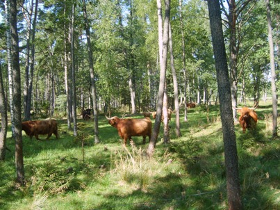 Skotlannista kotoisin oleva Ylämaankarja sopii liharotuna hyvin luonnonlaidunnukseen. Hankoniemellä Havsgårdar Oy:n karjaa laiduntamassa hakamaalla. Kuva: Reetta Tuupanen.